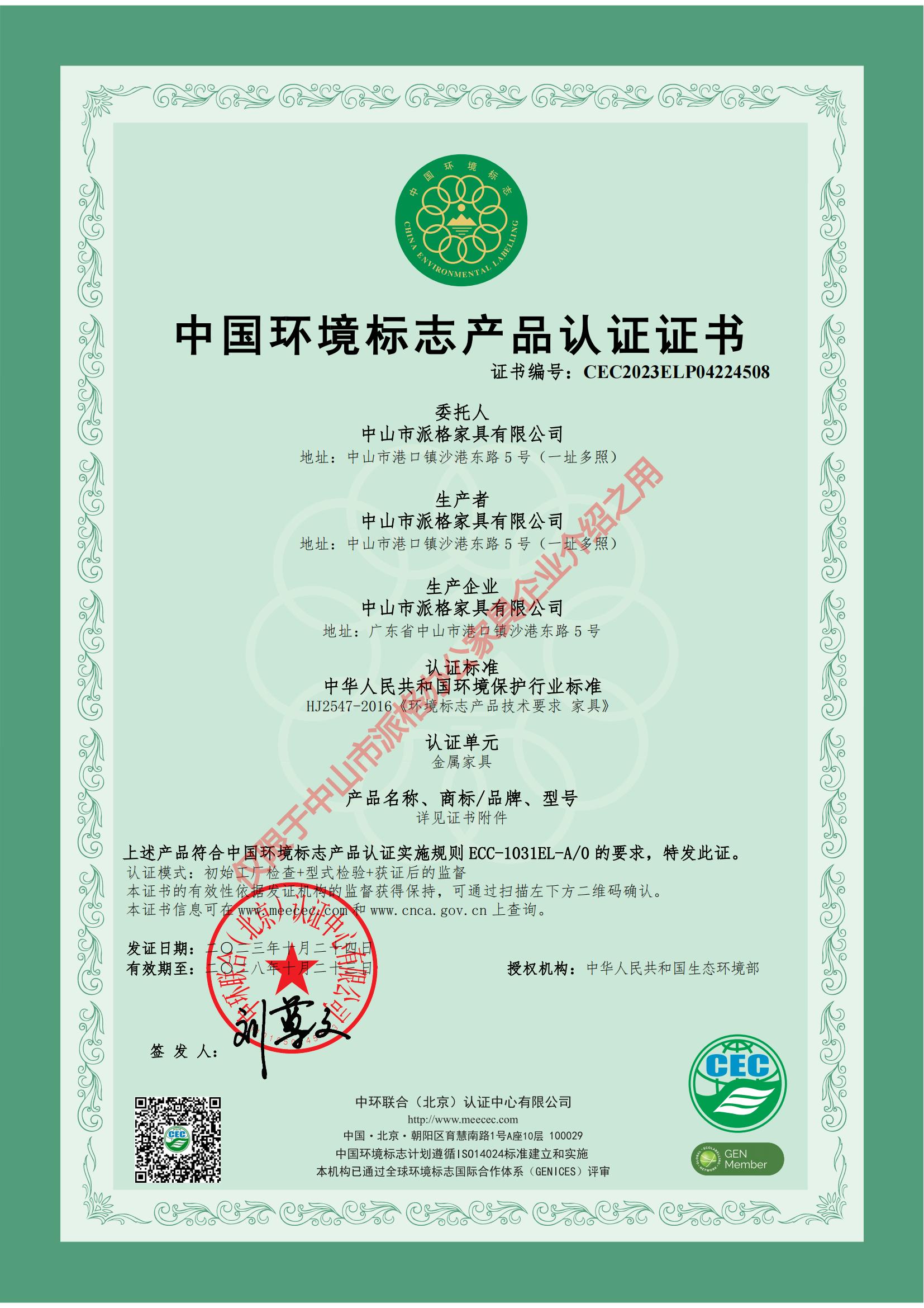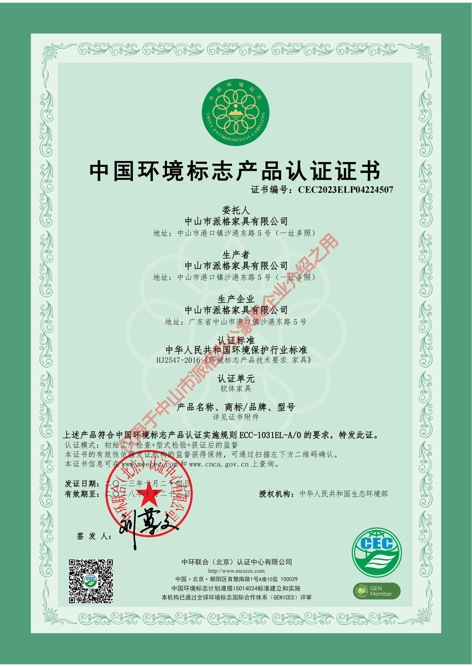 中國環(huán)境標志產(chǎn)品認證證書