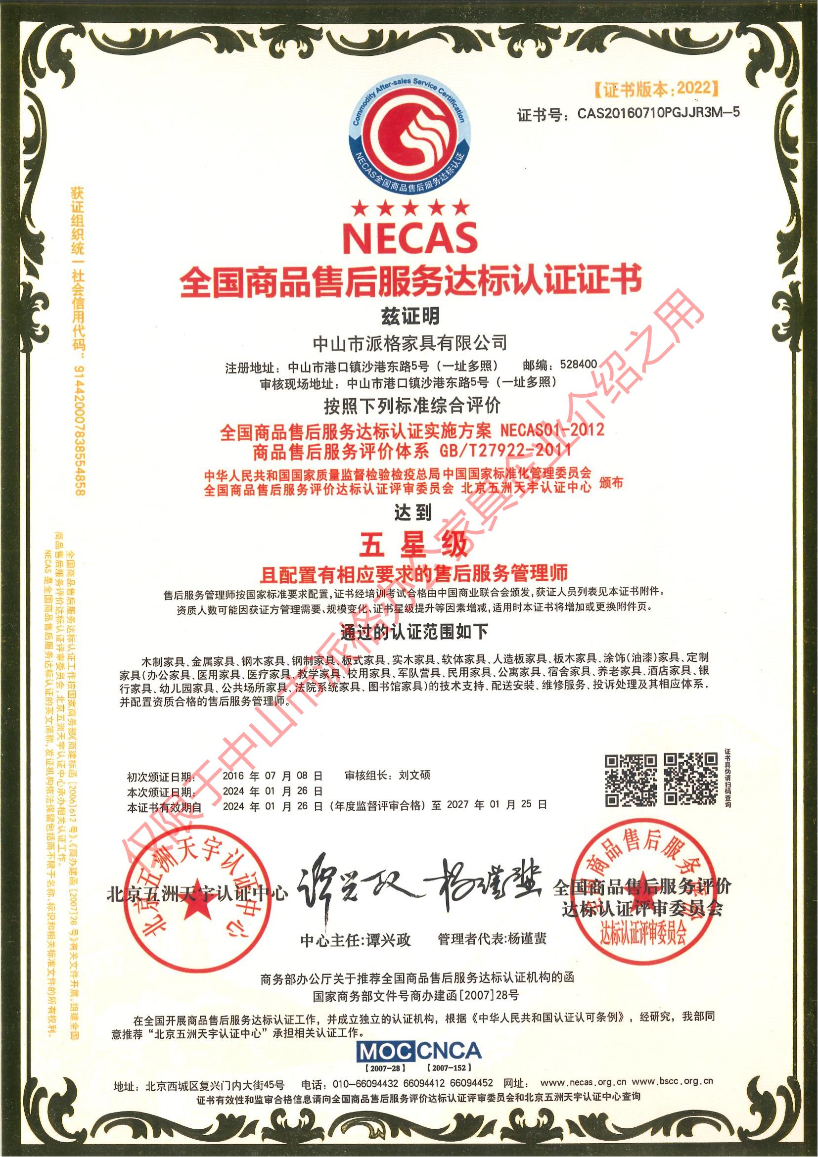 全國商品售后服務(wù)達標認證證書