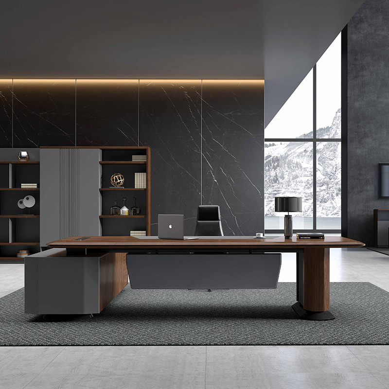 1、采用進(jìn)口天然美洲胡桃木皮/水性環(huán)保漆 2、臺面配有多功能電源(藍(lán)牙音箱、插座),方便用電和走線 3、副柜配配有LED氛圍燈